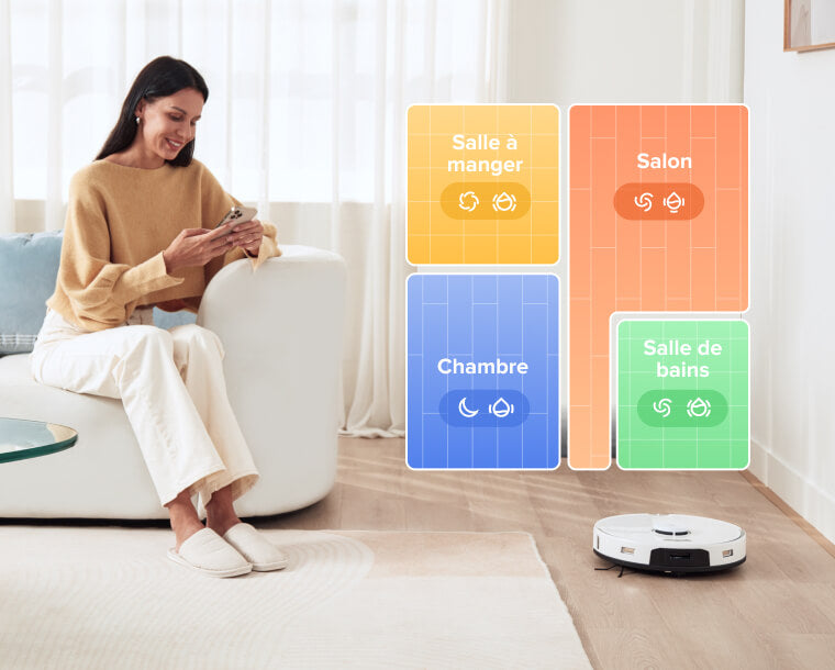 Recréez votre logement ainsi que tous ses meubles et types de sols directement dans l’application Roborock. C’est automatique et lorsque la cartographie est terminée, vous pouvez ajouter votre mobilier, notamment vos lits, canapés, tables et autres. Vous avez besoin de nettoyer autour de votre lit après un petit déjeuner ? Il vous suffit d’un simple clic sur votre lit.