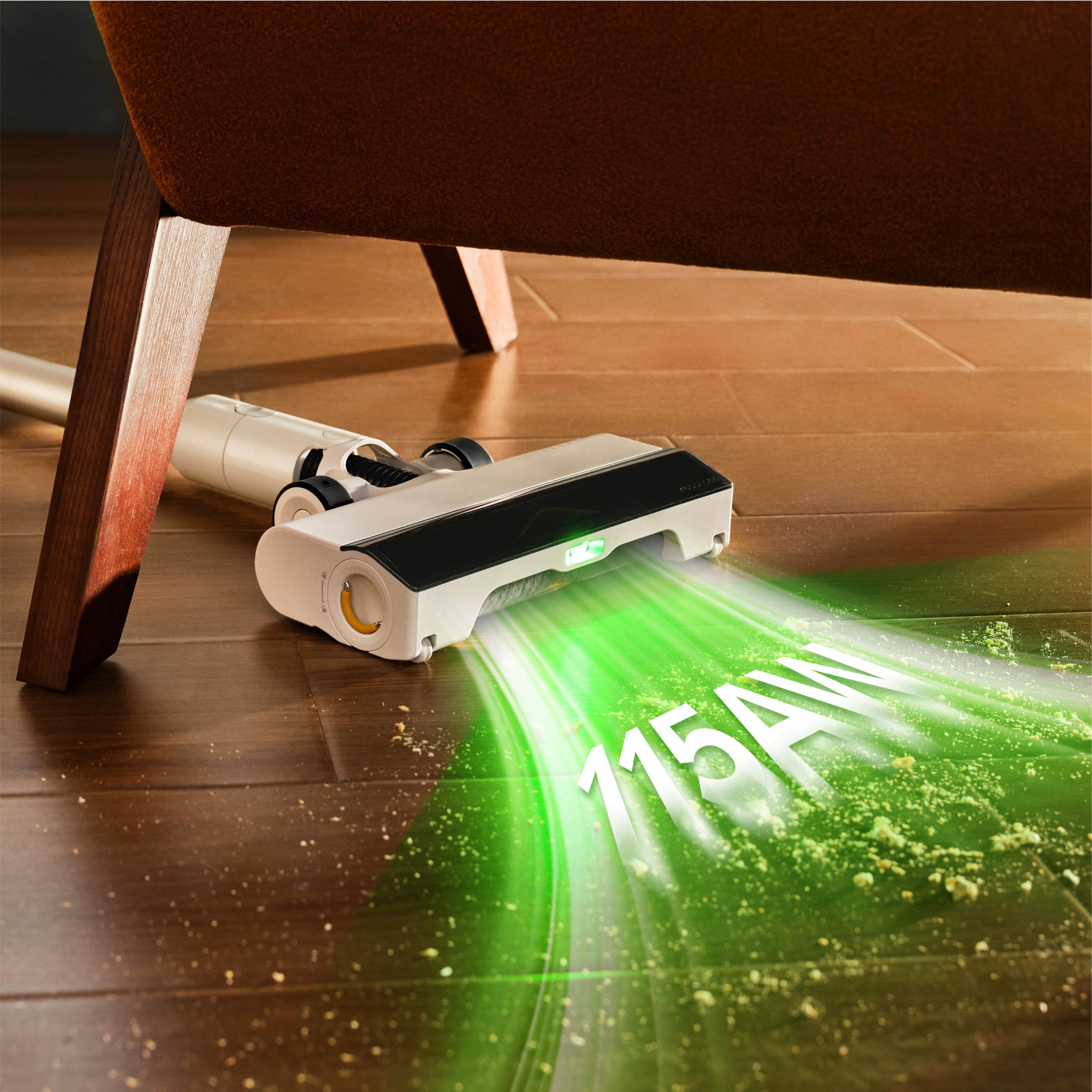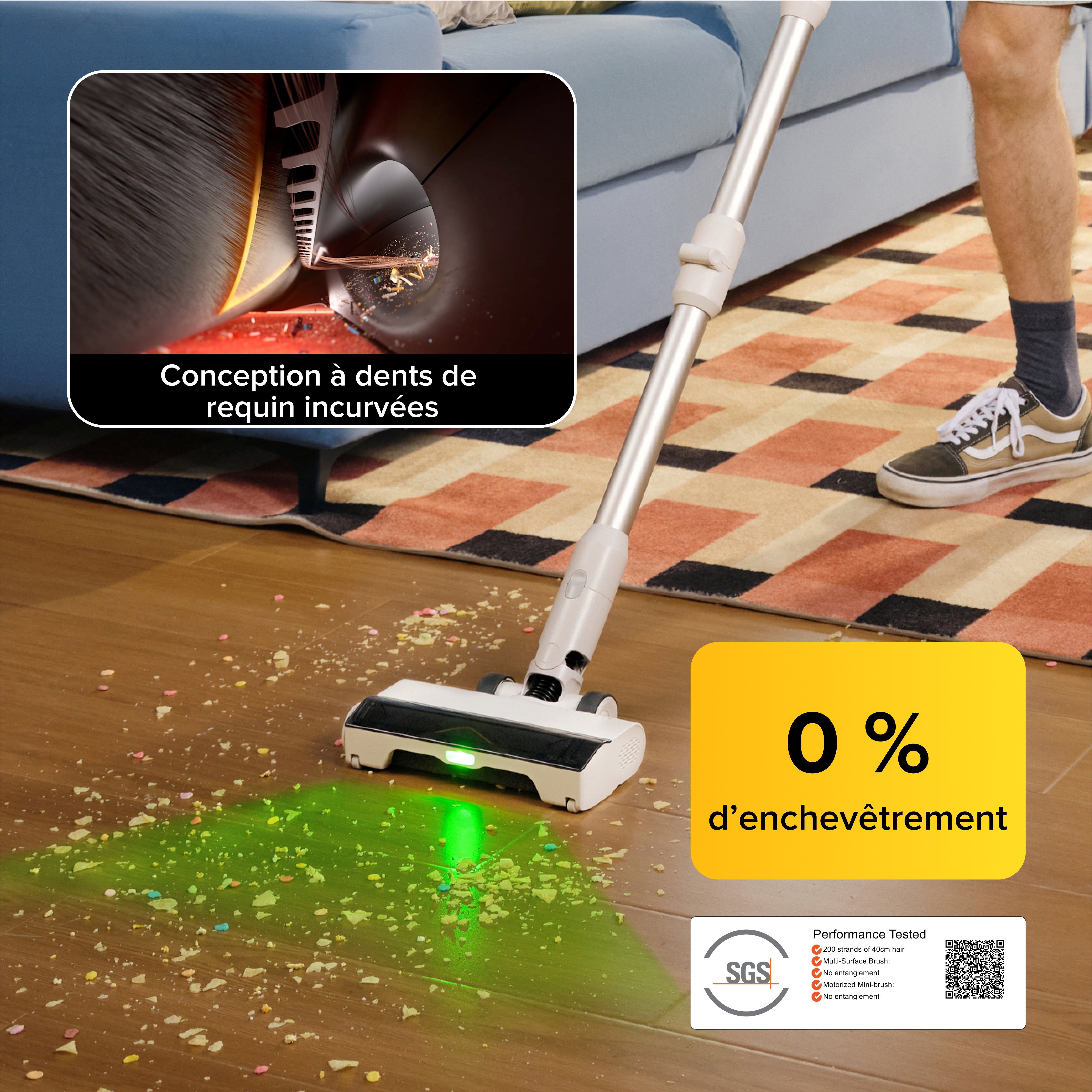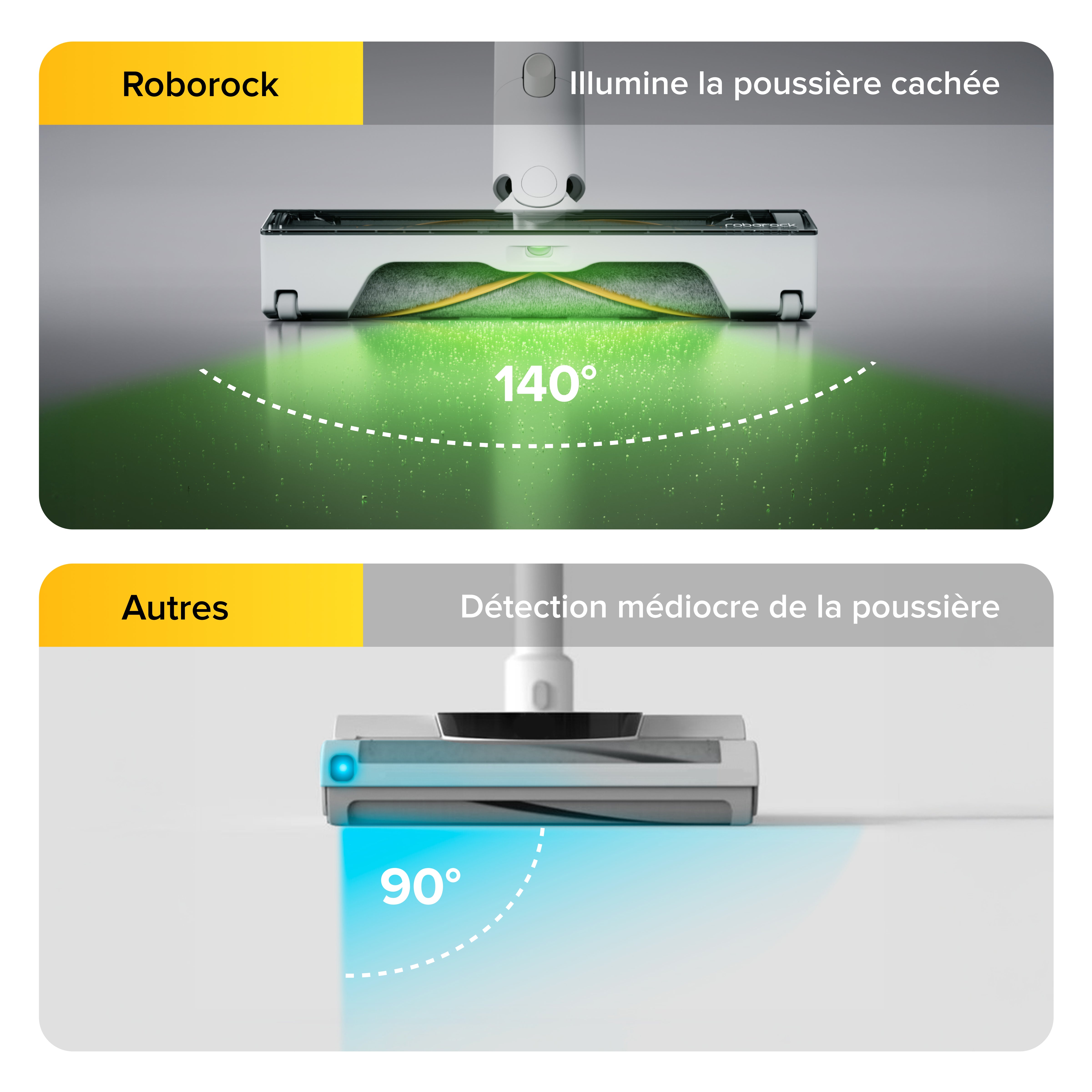 Une puissante lumière verte révèle la poussière invisible et les particules fines, tandis que son ultra-grand angle de 140° et son alignement central assurent une couverture maximale du sol pour un nettoyage en profondeur.