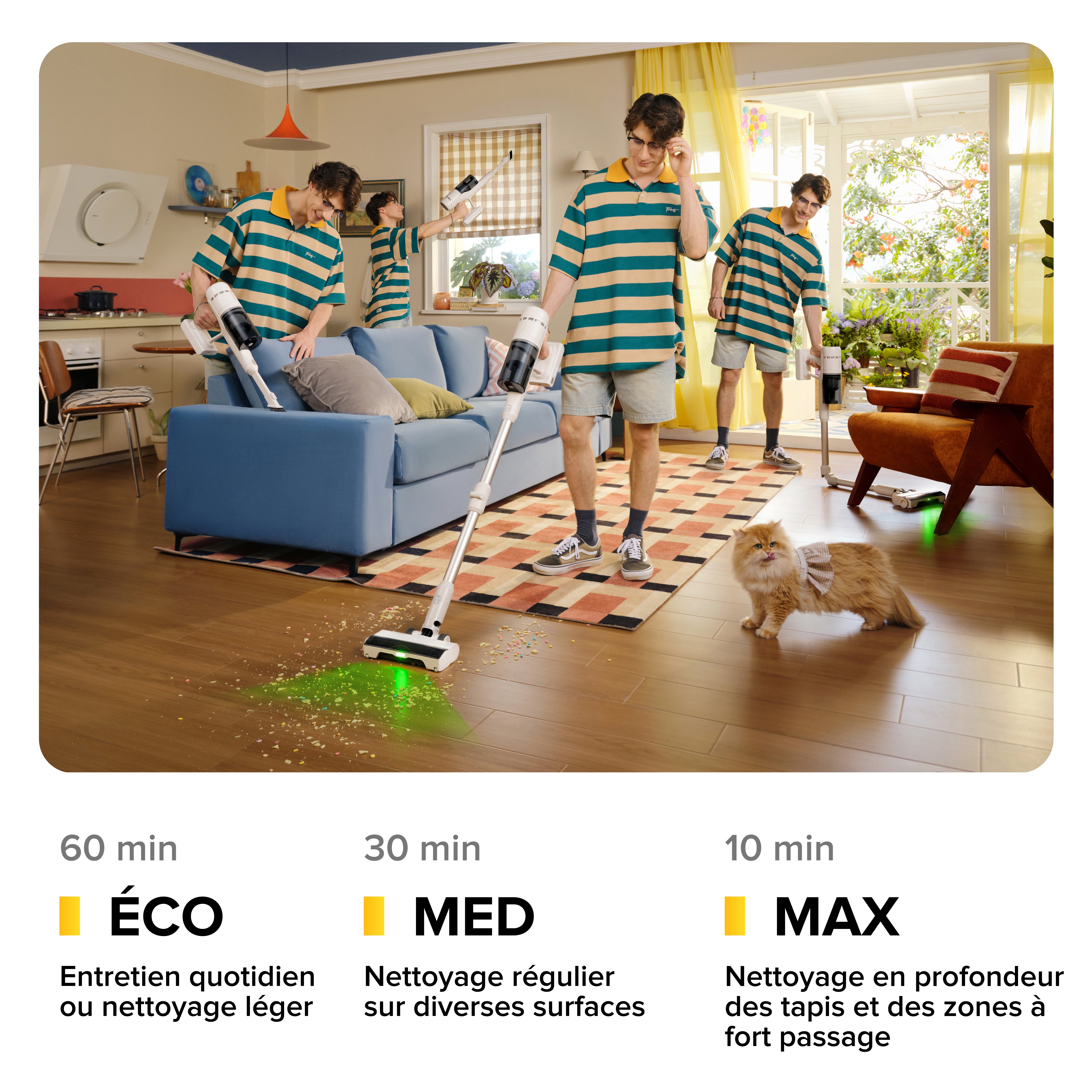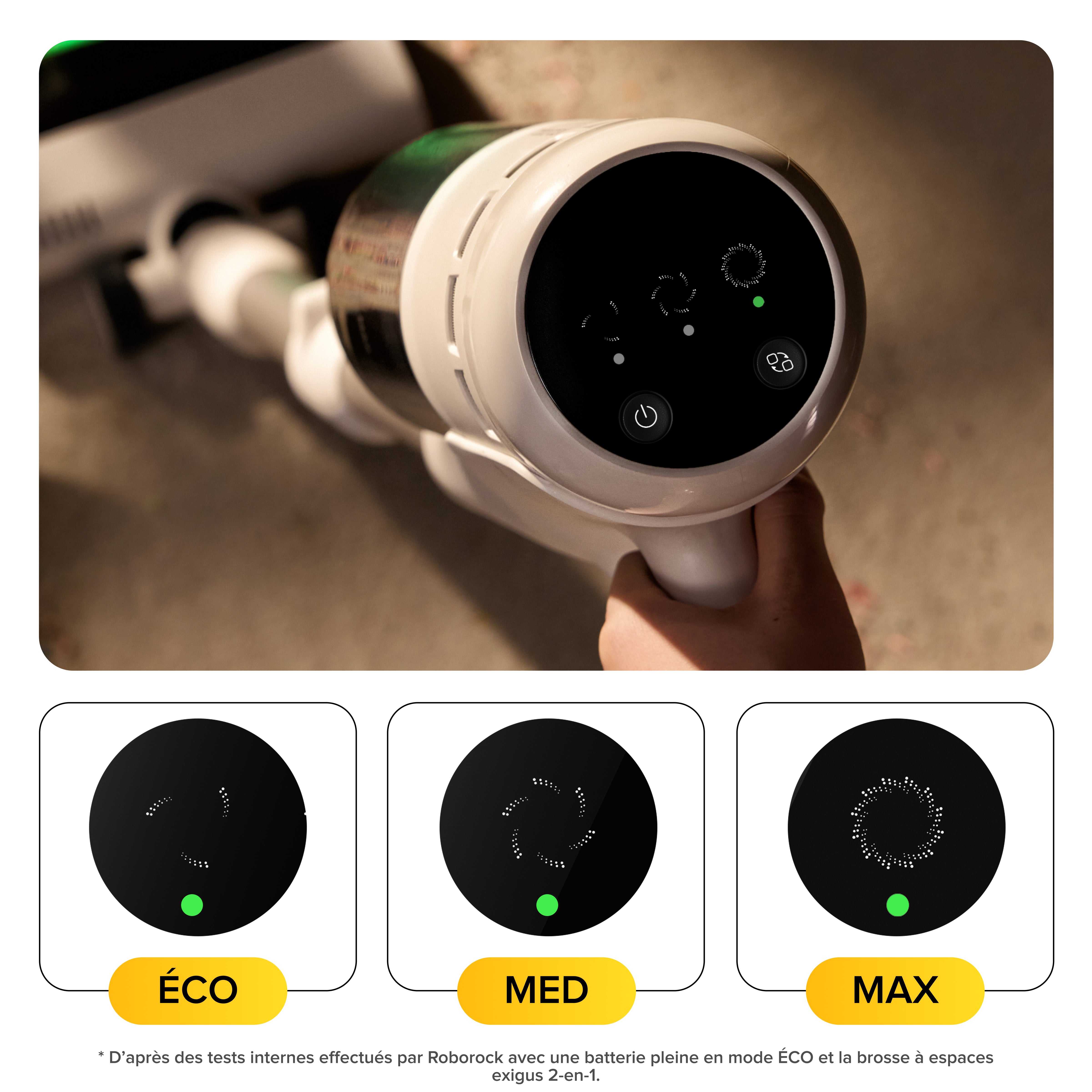 Qu’il s’agisse de poussière quotidienne, d’un nettoyage régulier ou de saletés incrustées dans les tapis, le Roborock H60 s’adapte à vos besoins grâce à trois modes de puissance personnalisables. Passez facilement des modes ÉCO à MED ou MAX pour équilibrer performances et autonomie, en délivrant la puissance idéale là où elle est nécessaire.