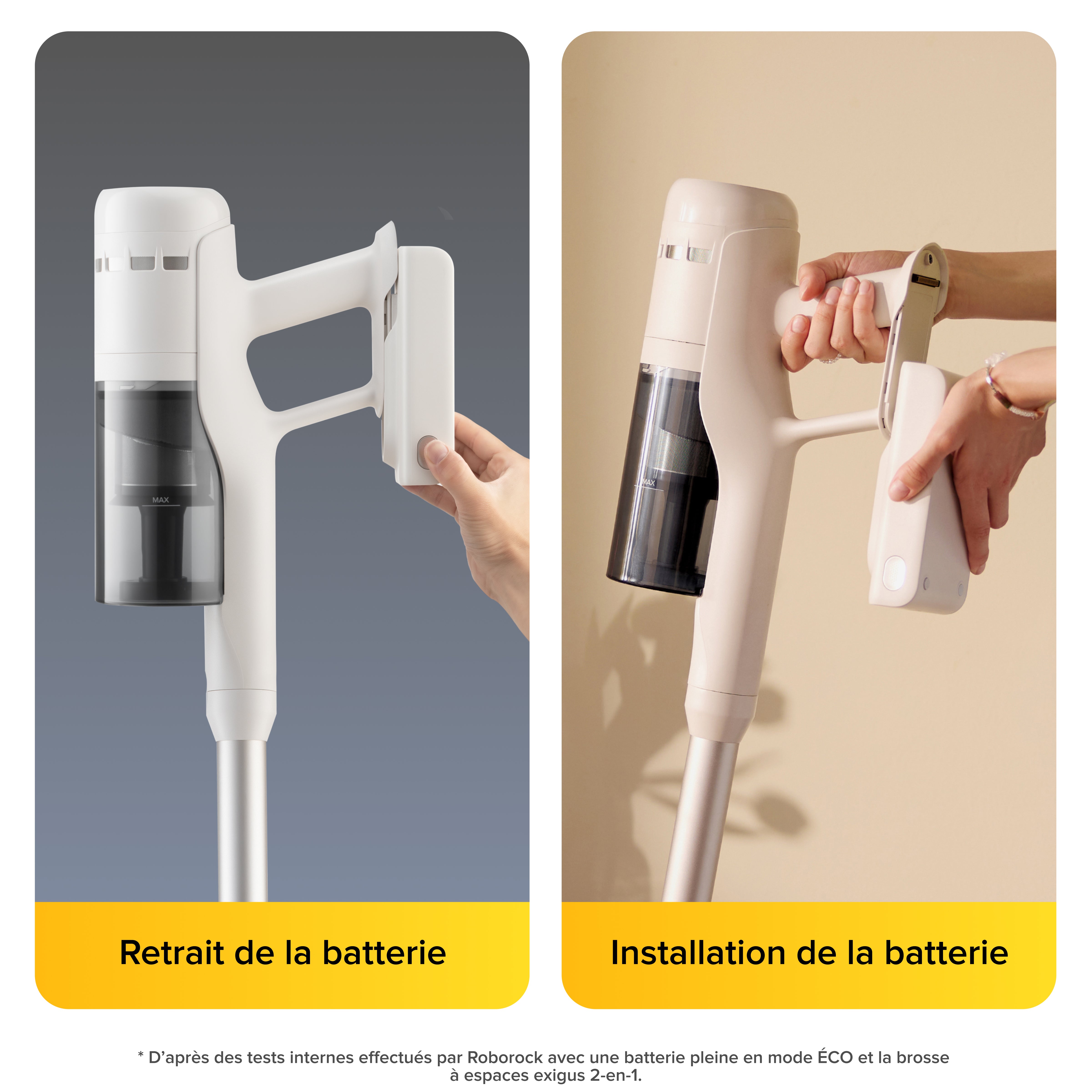 Le Roborock H60 est équipé d’une batterie amovible affichant le mode de nettoyage et l’autonomie restante en temps réel. Vous pouvez la retirer facilement pour la recharger, afin que votre aspirateur soit toujours prêt à fournir des performances puissantes, quand vous en avez besoin.